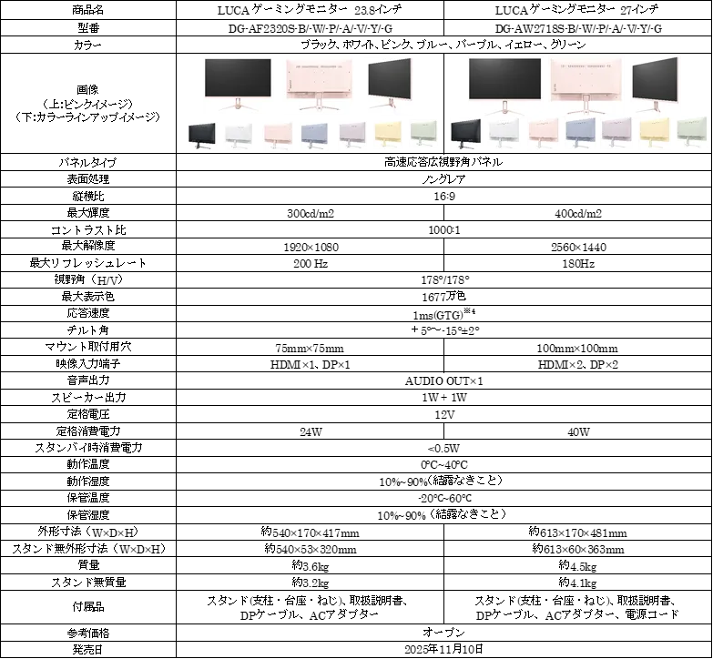 アイリスオーヤマ初『LUCA』ゲーミングモニターが11/10発売、7色展開