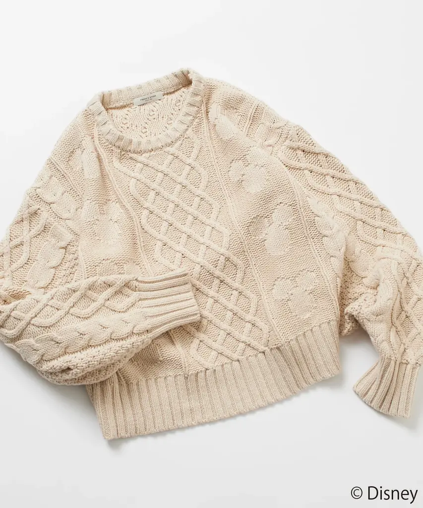 ケーブル編みの中に“隠れミッキー”を取り入れたニット。丈感や編み方にまで細かな配慮がなされ、ゆったりとしたシルエットで体型を拾いにくいリラックス感を重視した仕立てです。遊び心と高い着心地を両立させた自信作として紹介されています。