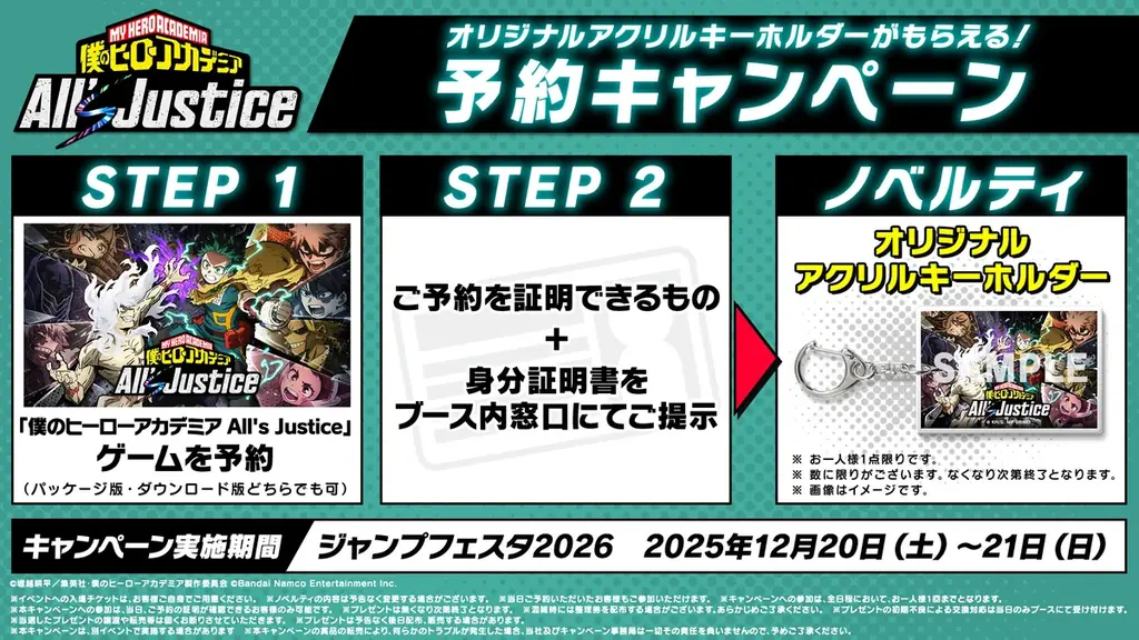 試遊台で『僕のヒーローアカデミア All's Justice』を国内最速でプレイ(1人/2人選択可)。大型映像、予約特典のアクリルキーホルダー、SNS投稿でステッカー配布など、ノベルティは先着・数量限定。