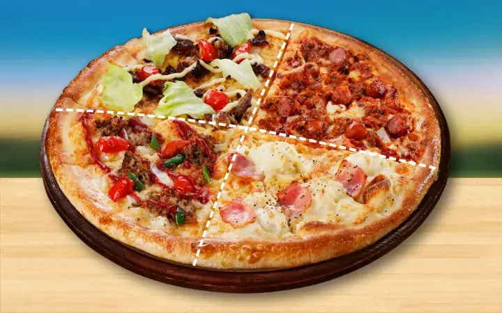 欧米編では4つのテーマピザを用意しています。各ピザは1枚で4種類の味を楽しめるUFOフォーマットで構成され、それぞれのコーナーに異なる具材やソースが施されています。