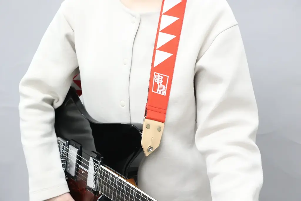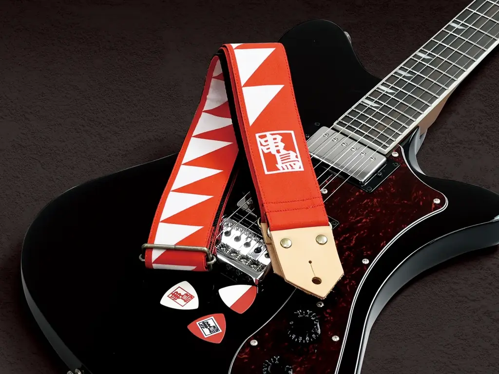 今回のコラボレーションで制作された商品はギターストラップギターピックの2種類です。それぞれに串鳥の象徴である紅白の配色やロゴが取り入れられており、ライブの舞台でも視認性が高いデザインとなっています。