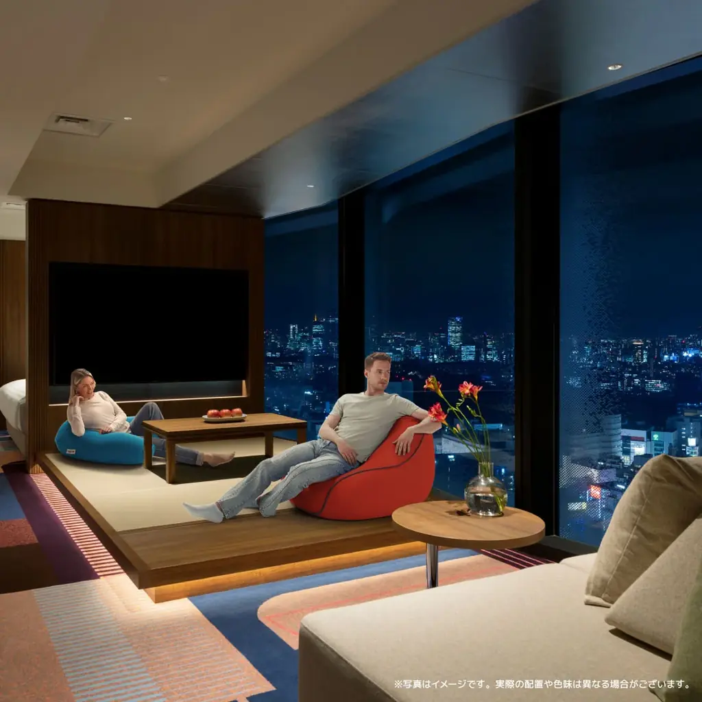 本企画では、歌舞伎町の中心に位置するホテルの61㎡のPremier Suite TwinにYogiboソファを設置。都心の夜景を眺めながら、畳スペースで映画や読書を楽しむなど、自由なスタイルで“動けなくなるほど快適”な体験ができることが打ち出されています。客室はプレミアスイートのツインタイプで、1室1泊83,281円~(消費税・サービス料込)からの設定です。