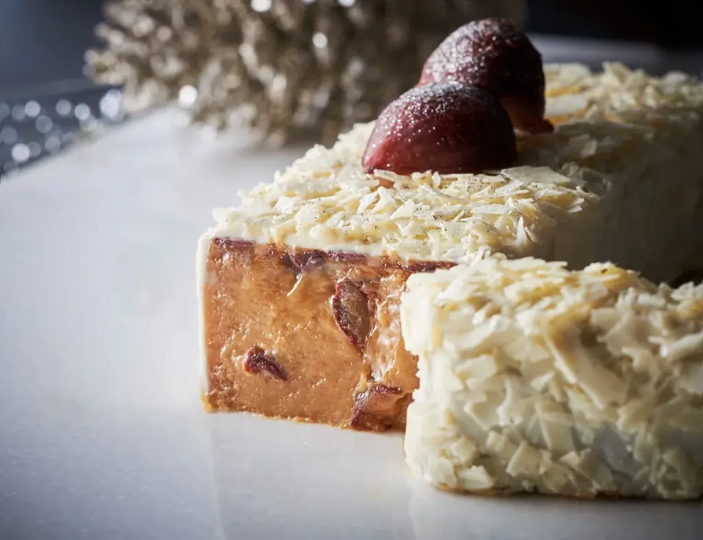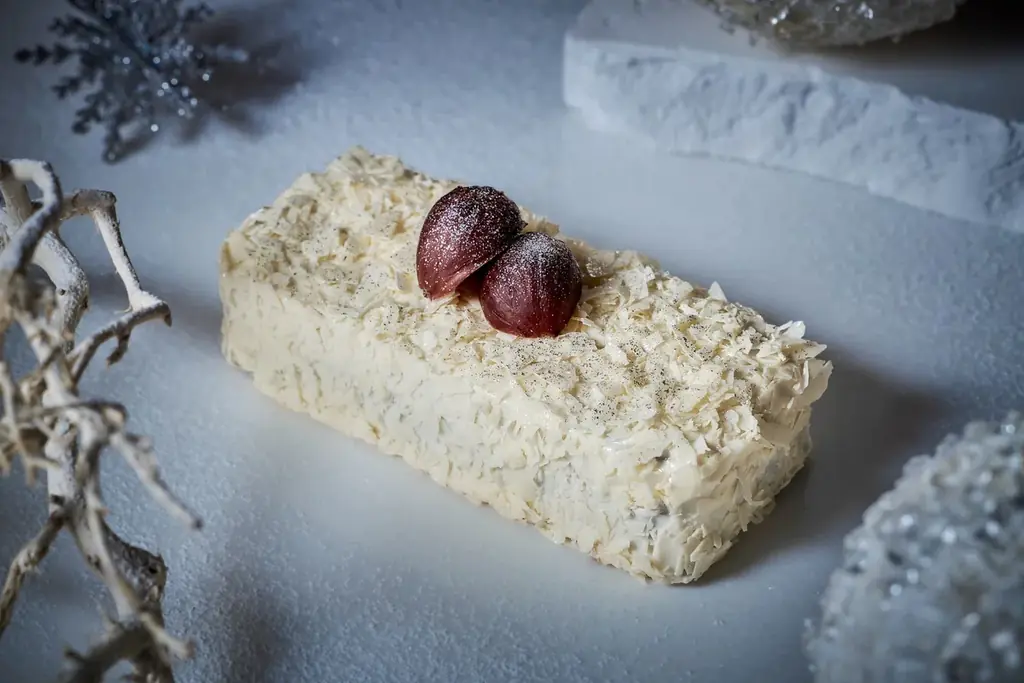 「白雪のマロンテリーヌ」は見た目にもこだわりがあり、しっとりと艶やかなテリーヌ生地の上に渋皮栗を贅沢にあしらって小さなオーナメントのような華やかさを演出しています。仕上げにはホワイトチョコレートを削り、雪が積もったような白い世界を表現しています。