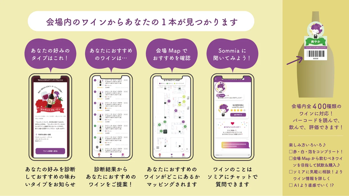 開場時間は10:00〜20:00(最終日は18:00閉場)で、会場ではSommiaによるAIワイン診断(飲み比べ・評価/パーソナライズ提案/AIチャット)が体験できます。
