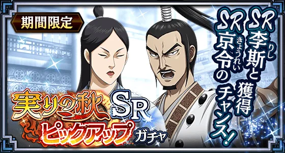 | 実りの秋(主な期間) | 第4弾パック:11月12日(水) 18:00 ~ 11月19日(水) 18:00 覚醒ガチャ:11月12日(水) 18:00 ~ 11月26日(水) 14:00 SRピックアップ(李斯・京令):11月12日(水) 18:00 ~ 11月19日(水) 14:00 URセレクト:11月14日(金) 18:00 ~ 11月26日(水) 14:00 復刻争覇戦★6追想ガチャ:11月17日(月) 18:00 ~ 11月24日(月) 18:00 |