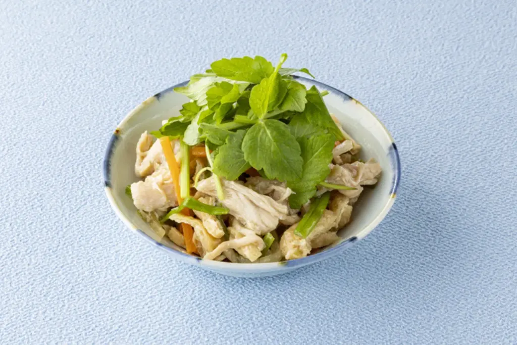 柔らかく仕立てた蒸し鶏とせりを組み合わせ、だしの風味が感じられるだし醤油で和えています。「せり」の香りと食感を活かすための味付けに配慮した一品です。
