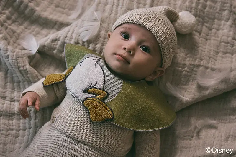 - bumbum / Donald(¥5,500_tax in)— お尻を出したドナルドダックの愛らしい仕草を描いたスタイ。対面には手を振る元気な姿があしらわれ、見る角度で異なる表情を楽しめます。