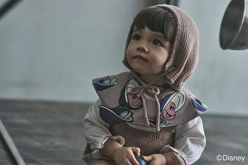 MARLMARLは“まあるい”スタイやお食事エプロンなどで知られるブランドで、ユニークかつ実用的なデザインが支持されています。今回のディズニーコレクションもその延長線上にある提案です。