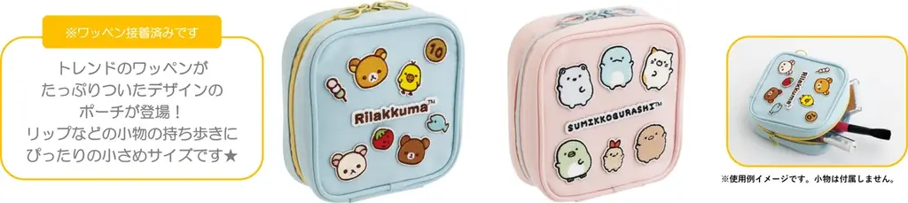 | スクエアミニポーチ | 各3,080円 | トレンドのワッペンが多数付いたデザインのミニポーチ。小物収納に適したスクエア型。 |