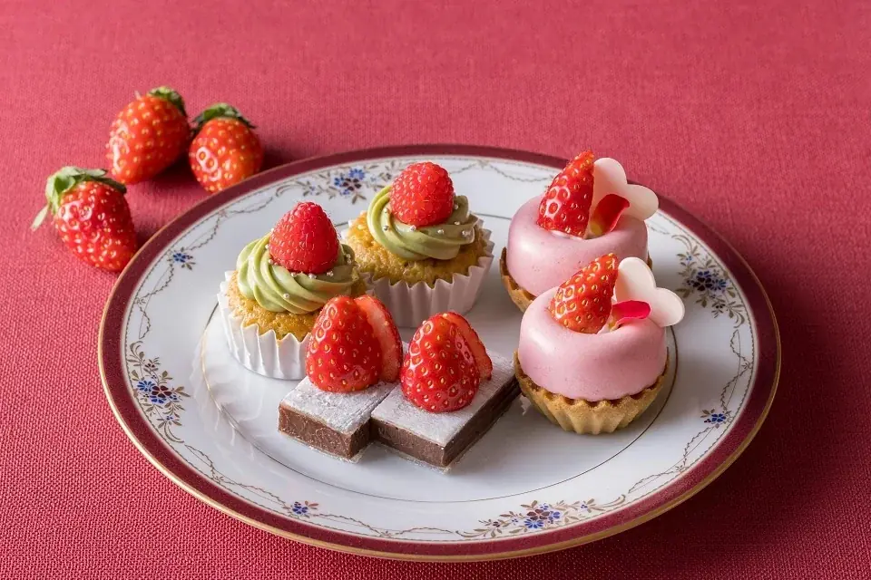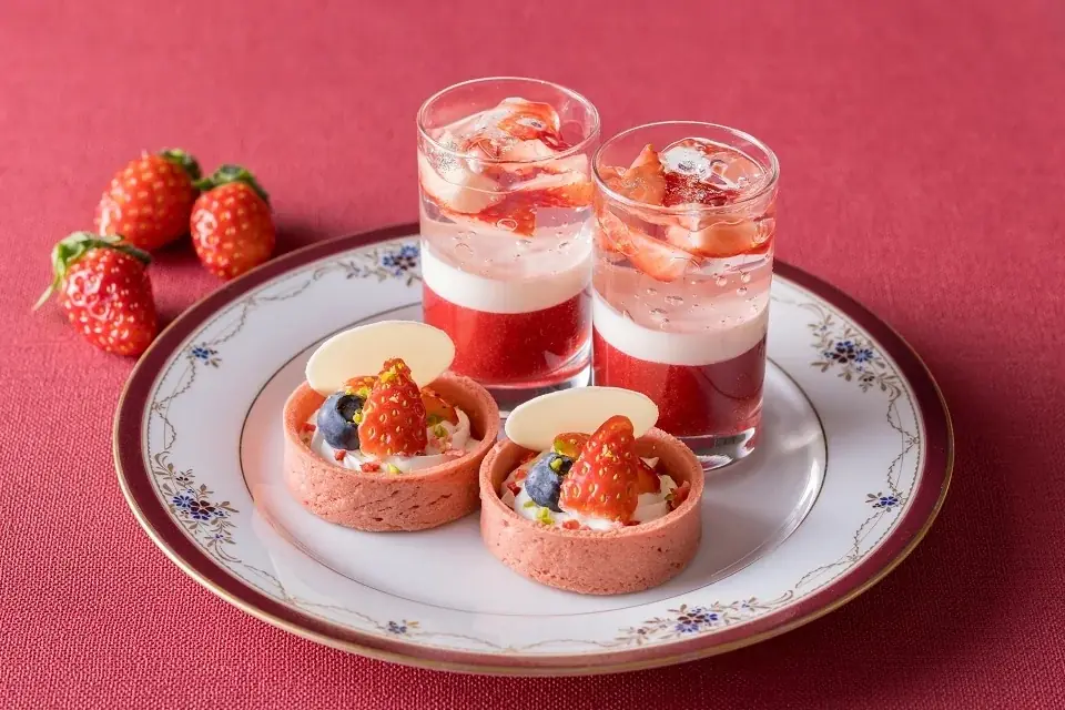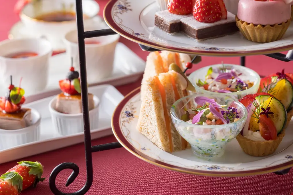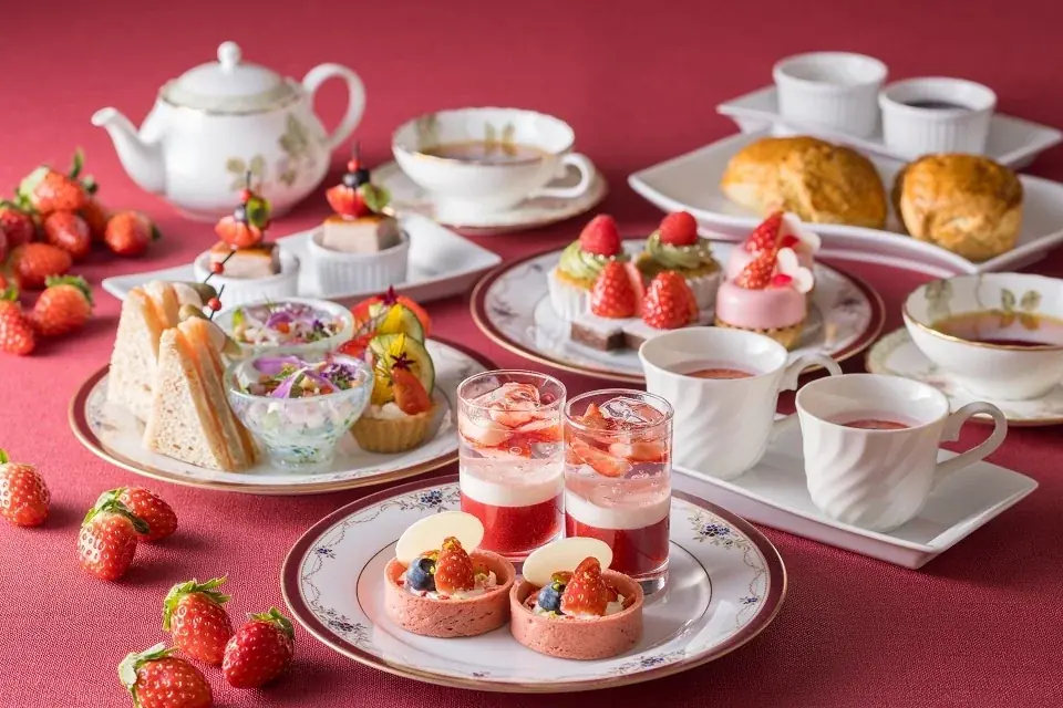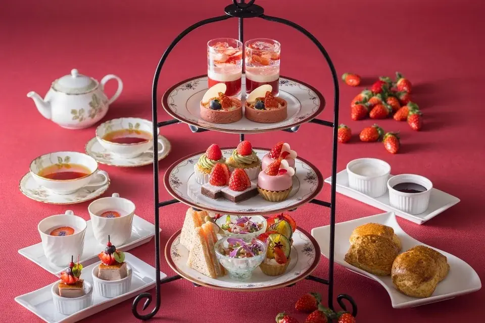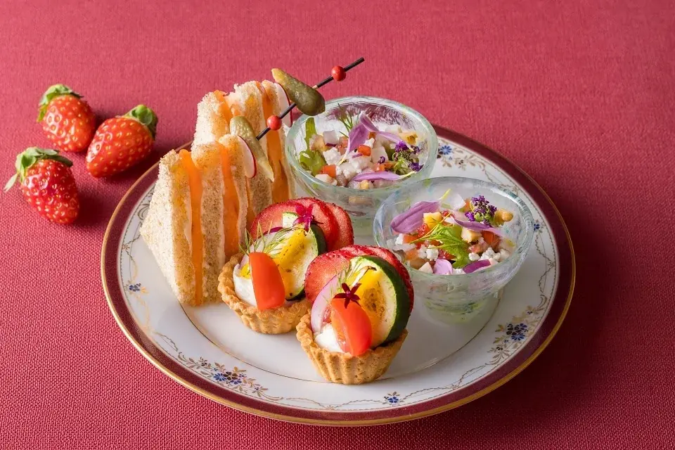 | メニュー(主な項目) | ストロベリーとローズのヴェリーヌ、ストロベリータルト、ストロベリームース、求肥のガナッシュサンド、ピスタチオカップケーキ、苺と野菜のタルト、苺と鶏肉のサラダ、スモークサーモンのサンド、紅茶鴨のロースト、苺のスープ、プレーンスコーン、紅茶のスコーン、ジャム、クロテッドクリーム |