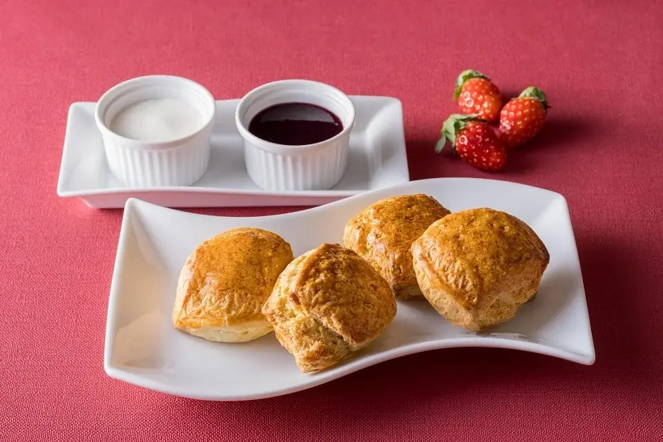 - プレーンスコーン、紅茶のスコーン、ベリージャム、クロテッドクリーム