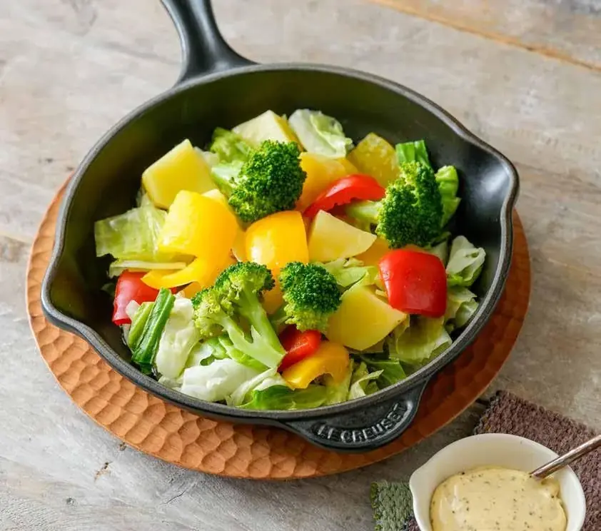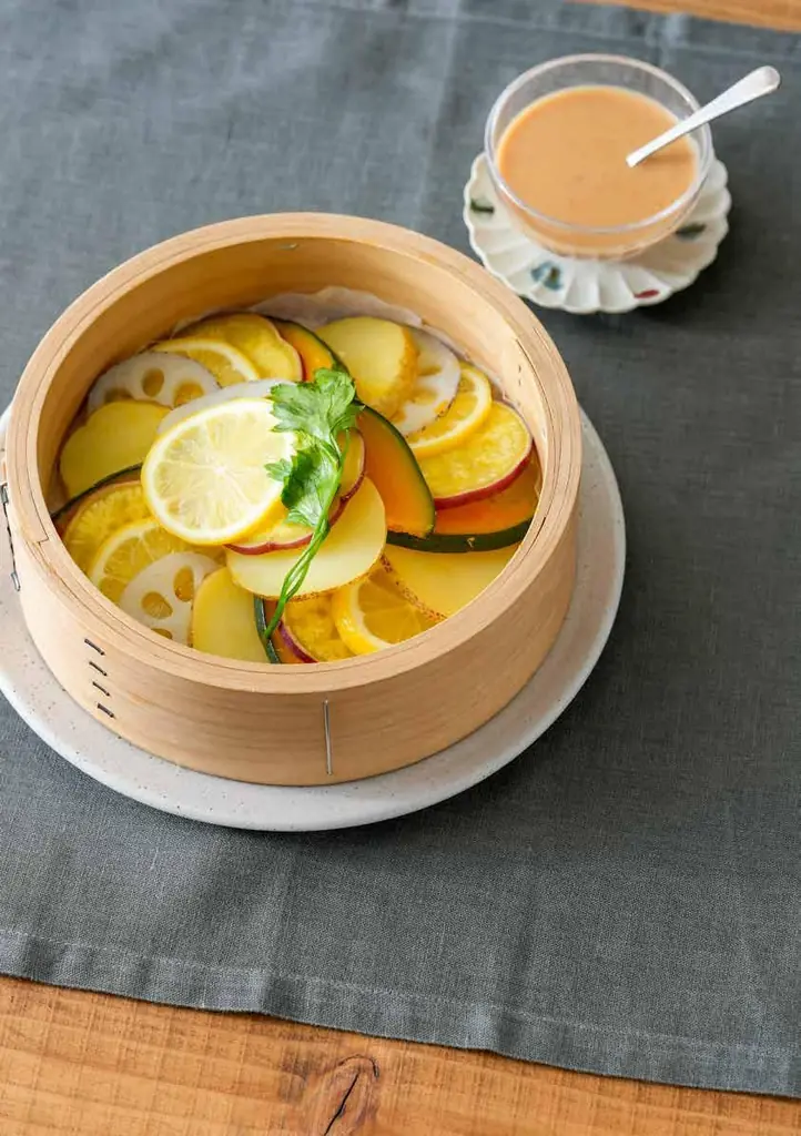 蒸し料理の利点の一つは、栄養素を逃さずに調理できる点です。野菜の章では、複数の野菜を一度に蒸して彩りと栄養バランスを整えるレシピを中心に、時短であと一品を用意できるフライパン活用法も紹介しています。