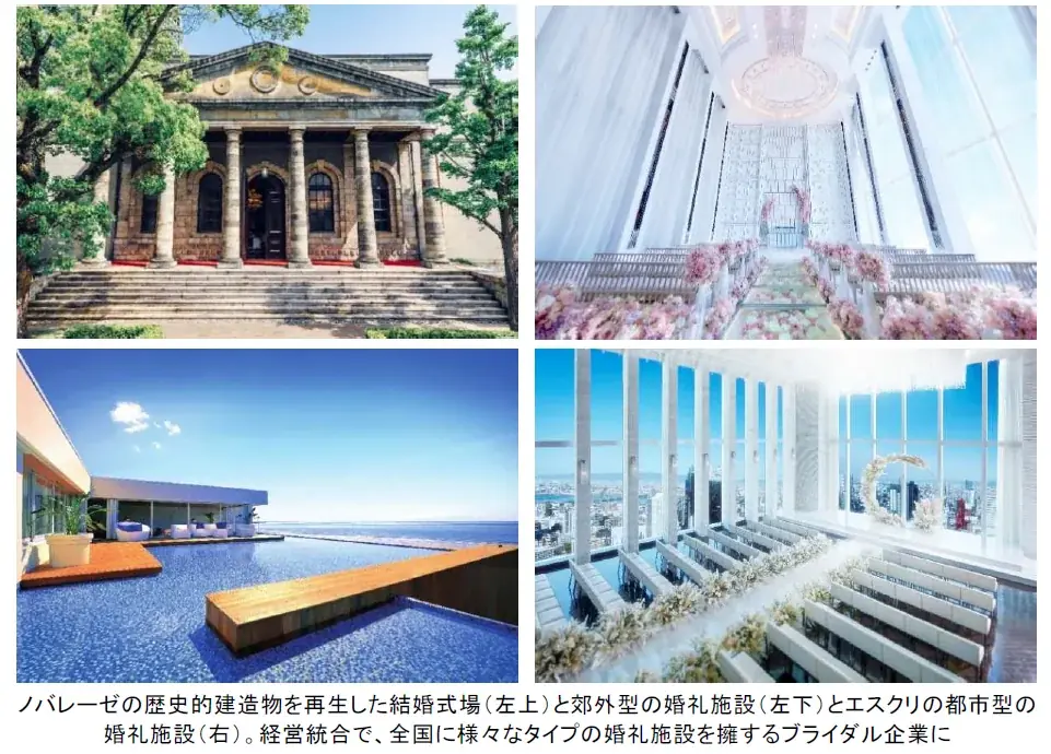 - 全国を網羅する婚礼ネットワークの構築:エスクリの都市型施設とノバレーゼの地方施設を組み合わせ、自社運営の婚礼施設は1都2府28県で合計68施設に拡大。売上規模は450億円に達する見込みで、ブライダル事業の売上規模では国内最大級を目指す。
