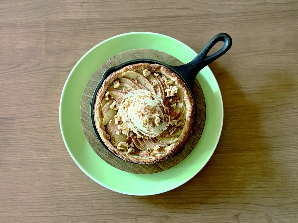 スキレットで香ばしく焼き上げることで、サンふじの豊かな風味が前面に出て、3種のりんごが互いに補完し合う構成になります。これにより、軽やかな酸味としっかりした甘みの両方が愉しめる配慮がされています。