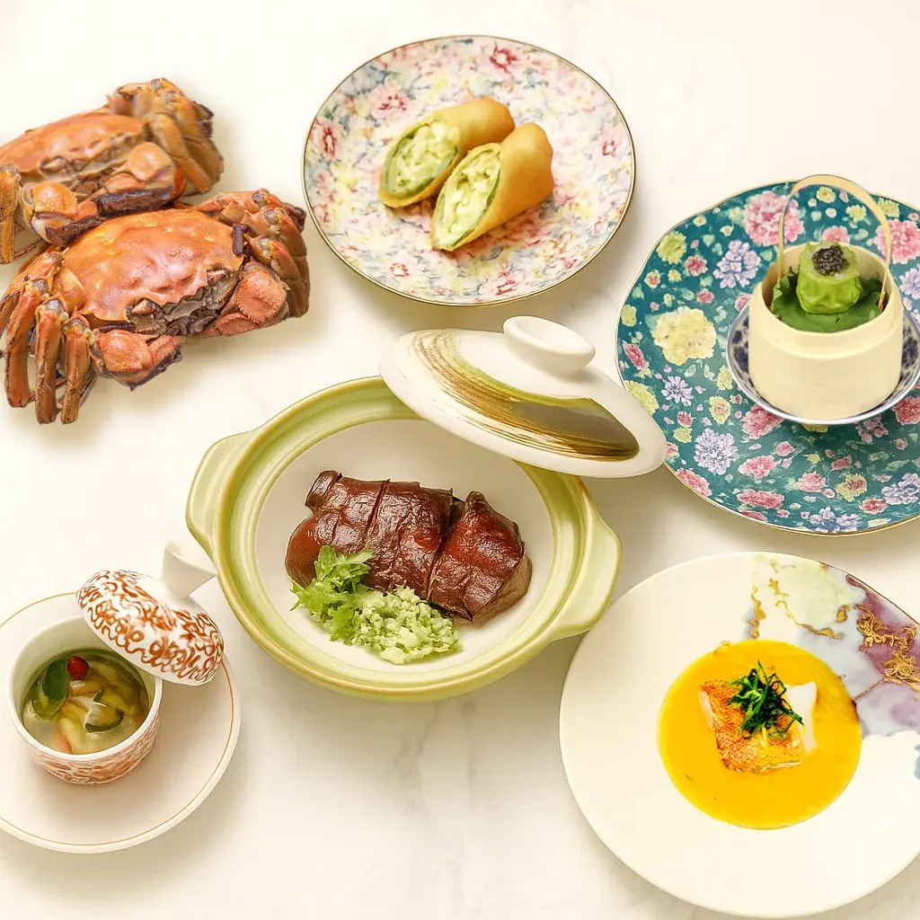 主役となる食材は旬の上海蟹、鱈の白子、そして風味豊かなカラスミです。これらをフカヒレ、鮑、雲丹、フォアグラ、活オマール海老、和牛などの高級食材と組み合わせ、香港料理のテクニックで仕上げることで季節性と豪華さを両立させています。メニューは仕入れ状況により変更となる場合がある旨も明記されています。