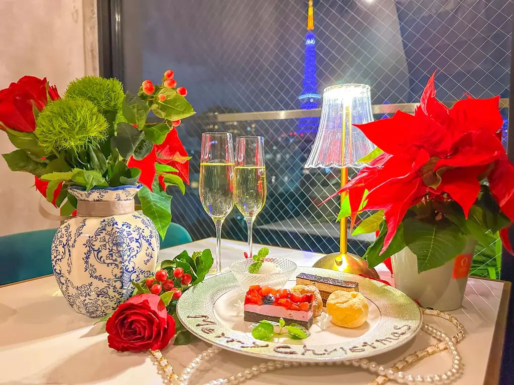 12月限定コースは乾杯用スパークリングワイン1杯が付く全8品の構成です。東京タワーの夜景を眺めながら楽しむ聖夜限定のディナーとして、華やかなデザートプレートが特長となります。