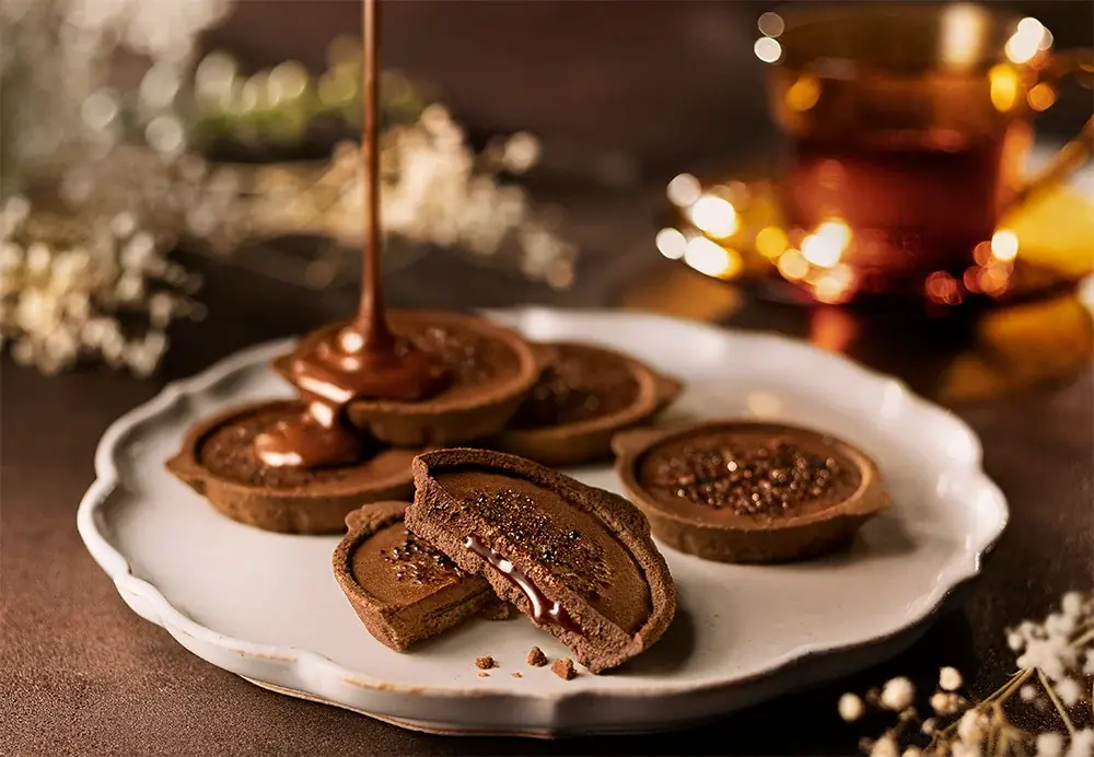 さくさくのショコラタルト生地に、ショコラクリームを充填し、その中にショコラキャラメルソースを仕込んであります。表面は直火でブリュレし、香ばしさを与えることで「パリとろ」の食感に仕立てています。タルト、クリーム、ソースのすべてがチョコレートに寄せられた構成で、冬の季節に合った濃厚な味わいが特徴です。