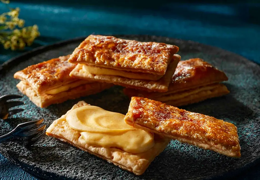 カスタード感のあるショコラクリームにラムとバニラの香りを効かせ、表面はブリュレ仕立てのサクサクパイで覆ったミルフィーユです。クリームのコクと香ばしいパイの歯切れ良さが特徴的で、温度差による食感の変化を楽しめます。