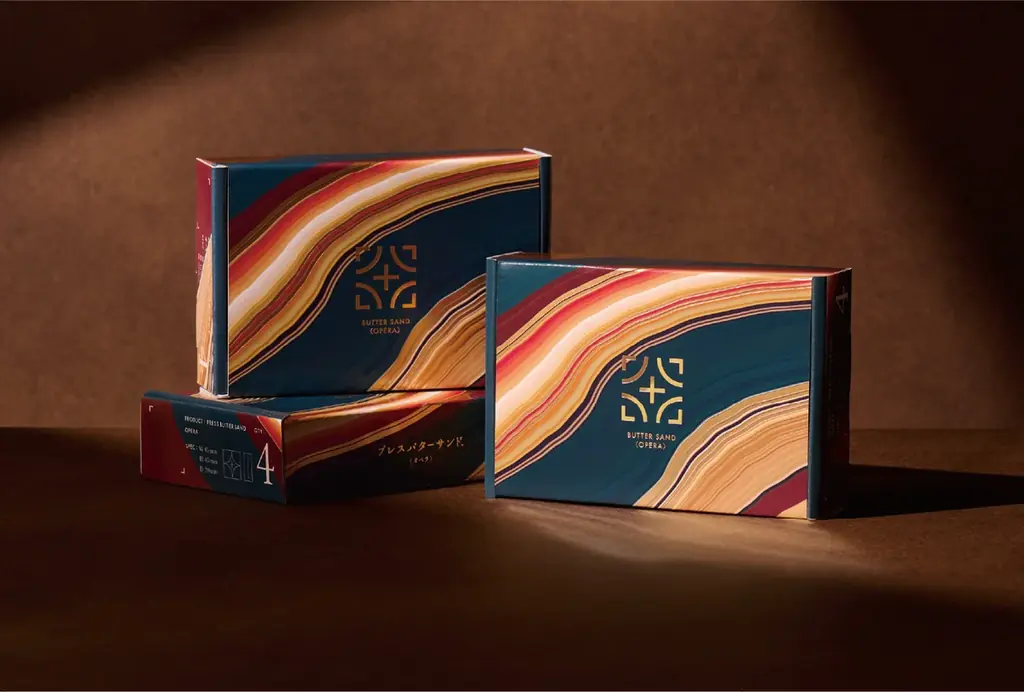 「バターサンド〈オペラ〉」はフランス伝統菓子のオペラから着想を得た一品で、芳醇なコーヒーの香りとチョコレートのビターな余韻を重視した構成です。甘さを抑えた味わいは「大人の本命ギフト」や「自分へのご褒美」に向く設計で、金箔を用いた上品な装いと併せ、特別な日の贈り物にふさわしい高級感を備えています。