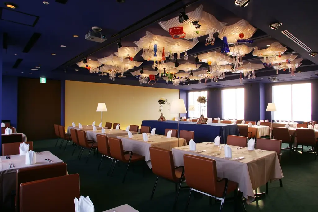 「MOON GLOW(ムーングロー)」は2007年にオリエンタルホテル広島の最上階にオープンしたイタリアンレストランであり、内田氏が設計デザインを担当しました。深いブルーとイエローを基調とした壁面が夜空を連想させる空間設計になっており、その天井装飾はシーペック氏によるガラス作品が広がるインスタレーションとして知られていました。