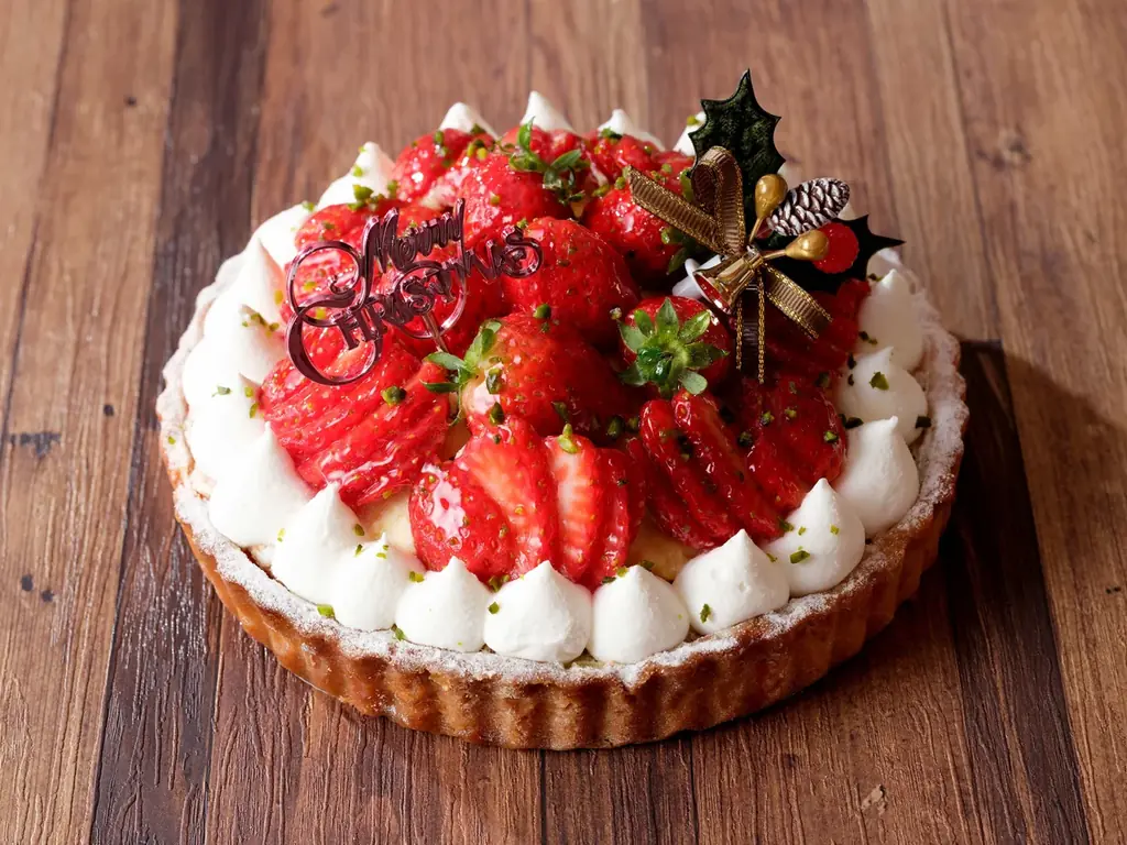 苺一杯のクリスマスタルトは直径18cmのアーモンドタルト生地を使用したタルトです。さっくりとしたタルト生地に国産苺をたっぷりと並べ、果実の甘酸っぱさと香ばしさのバランスが楽しめる鮮やかな一品に仕上がっています。
