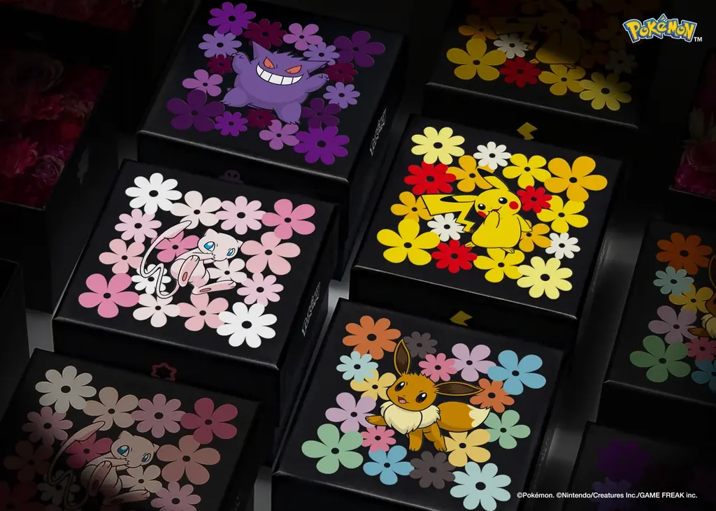 今回のコラボレーションでは、ピカチュウ、イーブイ、ゲンガー、ミュウの4種類のポケモンがフラワーボックスの上で輝くデザインとして採用されました。ボックス表面は光沢感があり肌触りの良い素材を用い、キャラクターがぷっくりと浮き出るように仕上げることで立体感と高級感を両立しています。