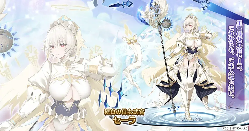 英傑化ユニット記念パック1では、レアリティブラック【英傑】の『極白の侍女武官セーラ』確定チケットが付属します。加えて神聖結晶や光彩聖霊、ブラックリングなどがついています。