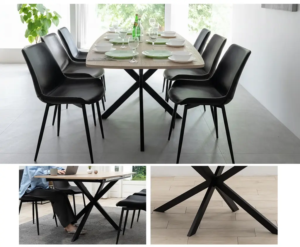 デザインは木目調天板とマットブラックのスチール脚を組み合わせたナチュラルで洗練された外観を意図しています。脚部はクロス構造を採用し、見た目の重厚感と同時に高い安定性を確保しています。椅子の配置や足元の動線を邪魔しにくい設計です。