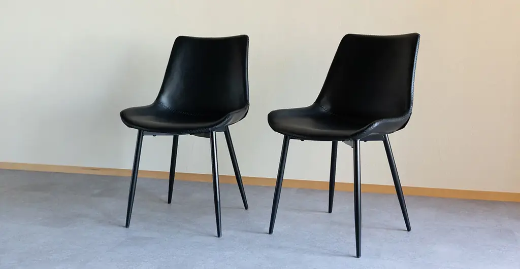 ダイニング5点セットには、同色のデザインチェア4脚が付属します。チェアはブラックとブラウンの2色から選択可能で、インテリアのトーンに合わせて統一感を出すことができます。チェアの座面高は約45cmで一般的なダイニングチェアの高さを踏襲しています。