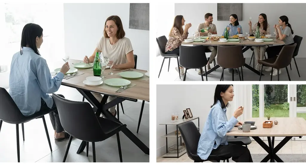 伸長操作は簡単で、わずか1〜2分で一人でも拡張が可能とされています。日常的にはコンパクトにしておき、来客時のみ広げる運用に向く設計であり、折りたたみ家具や伸長機構の設計に強みを持つEMOORらしいプロダクトです。