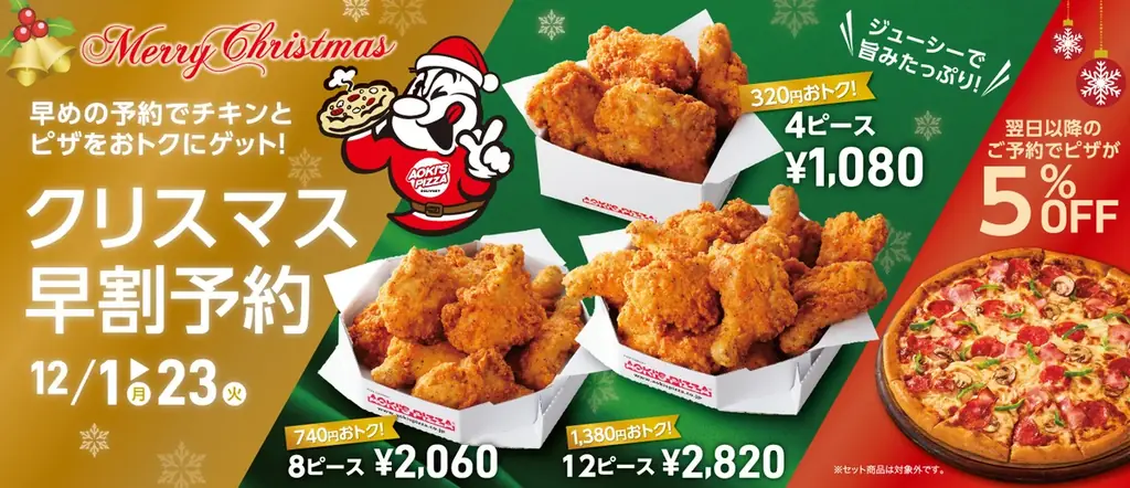 同日(2025年12月1日)より、クリスマス早割キャンペーンが2025年12月1日(月)〜12月23日(火)の期間で実施されます。対象はフライドチキンの大容量セットの割引と、クーポン利用によるピザの割引です。