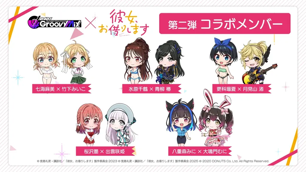 株式会社DONUTSは、2025年11月25日12時に配信された公式番組「水曜日のD4DJ」にて、スマートフォン向けリズムゲーム『D4DJ Groovy Mix』(通称グルミク)におけるTVアニメ『彼女、お借りします』とのコラボレーション第二弾を発表しました。発表内容にはコラボイベントの開催決定、ガチャ実装キャラクター、イベント報酬キャラクター、ストーリーあらすじ、さらにカバー楽曲の実装決定が含まれます。