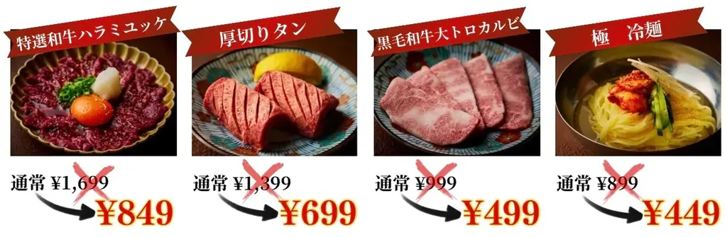 | 目玉キャンペーン(1) | 四大名物(厚切りタン・冷麺・大トロカルビ・ハラミユッケ)が半額 期間:2025年11月27日〜2025年12月30日 |