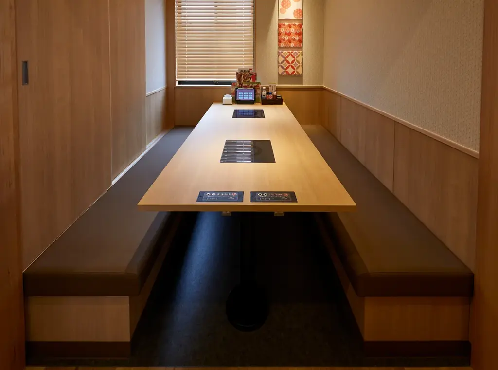 半個室はのれんで仕切られた4室があり、仕切りを外してつなげることで人数に応じた利用が可能です。家族やグループでの利用を想定したプライベート感のある空間が用意されています。