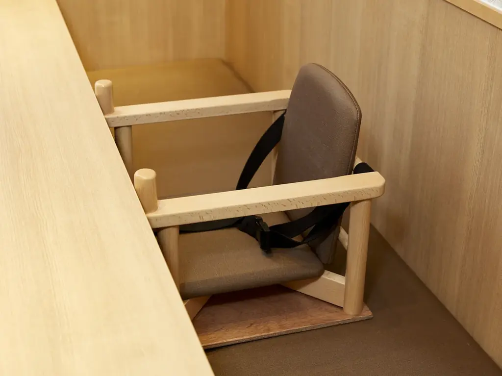 店舗はスロープ付きの玄関や広い通路といったバリアフリー設計を採用しており、車いすやベビーカーでも移動しやすいレイアウトです。フロア席にはベビーカーでそのまま座れる可動椅子があるほか、お子様用のいすや食器、そしてお手洗い内におむつ替え設備も用意されています。