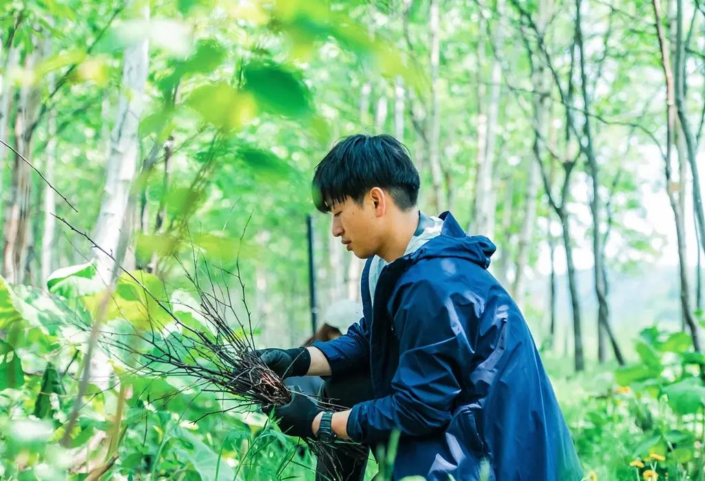 白樺ファームは2023年に開設され、将来的には使用した分だけ白樺の木を植え育て、そこから樹液を採取して使用するという資源循環のサイクルを目指す取り組みを進めています。2025年の初夏にはBOTANISTのスタッフが植林活動に参加し、ディフューザー用の枝を収集しました。