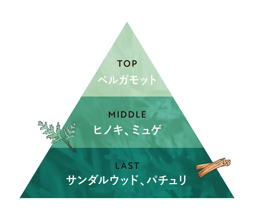 香りの設計:森林浴を思わせる「ヒノキとサンダルウッドの香り」