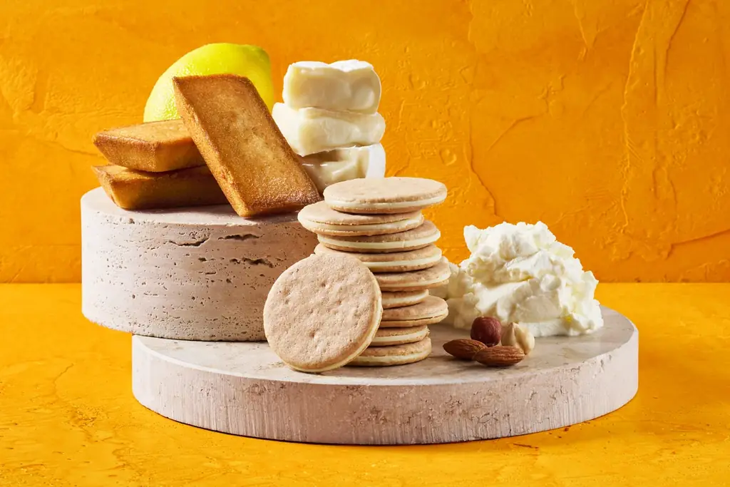 サンドクッキー〔マスカルポーネ&ヘーゼルナッツ〕とフィナンシェ〔カマンベール&レモン〕を組み合わせたセット商品です。贈答用途を想定した構成になっています。