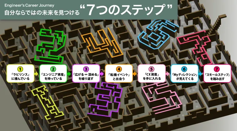 ワークショップのテーマは「キャリア資産の探索・発見と、キャリアディレクションの創造」です。エン・ジニアスが提示するエンジニアのCXモデルは、エンジニアがキャリアオーナーシップを獲得していくプロセスを「自分ならではの未来を見つける7つのステップ」として構造化しています。