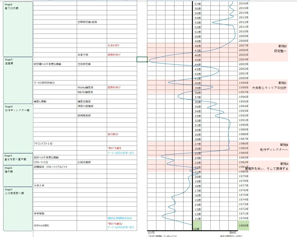 - 変化の履歴書(キャリア曲線ワーク):これまでのキャリアを振り返り、「広げる経験」と「転機イベント」を発見する作業。