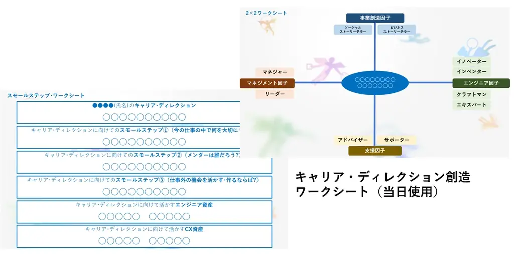 - 個人ワーク/グループワーク:可視化した資産をもとに「My キャリアディレクション」を創造し、明日から始める小さな一歩(スモールステップ)を描く。