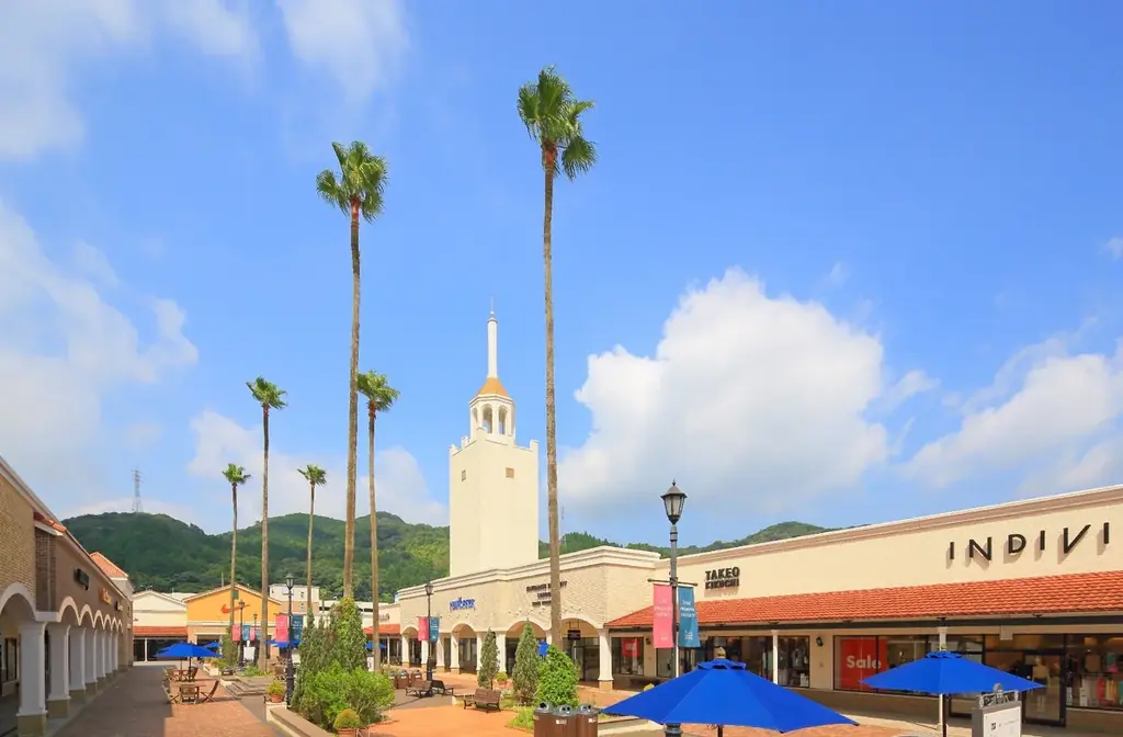 鳥栖プレミアム・アウトレットは、アメリカ・カリフォルニア州南部の街並みをイメージした施設設計で、白壁や暖色系屋根瓦、タイル模様が美しい屋外型モールが特徴です。そびえ立つヤシの木が施設内の景観を演出し、一日中アウトレットショッピングが楽しめます。