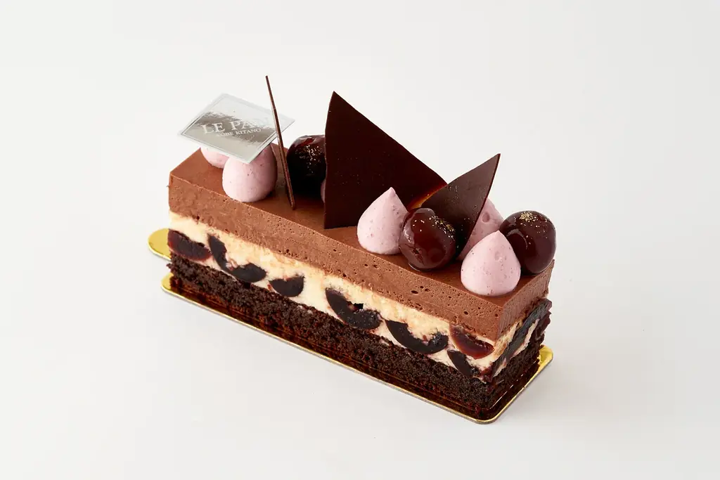 ドイツの伝統菓子「フォレノワール(フォレ・ノワール)」をル・パン流に再構築したチョコレート主体のスイーツです。チョコレートムース、チェリーの洋酒漬けを含むキルシュ風味のババロワ、チョコレート生地を層にして仕上げています。