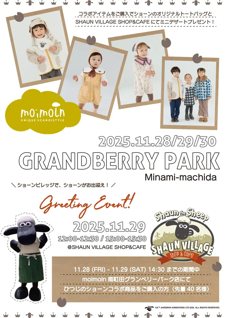 | 南町田グランベリーパーク店イベント | 2025年11月28日〜30日:ショーンビレッジ カフェでミニデザート提供(対象は同店購入レシート提示)/11月29日:ショーンとのグリーティング(12:00、15:00、各回約20名、参加券先着配布) |