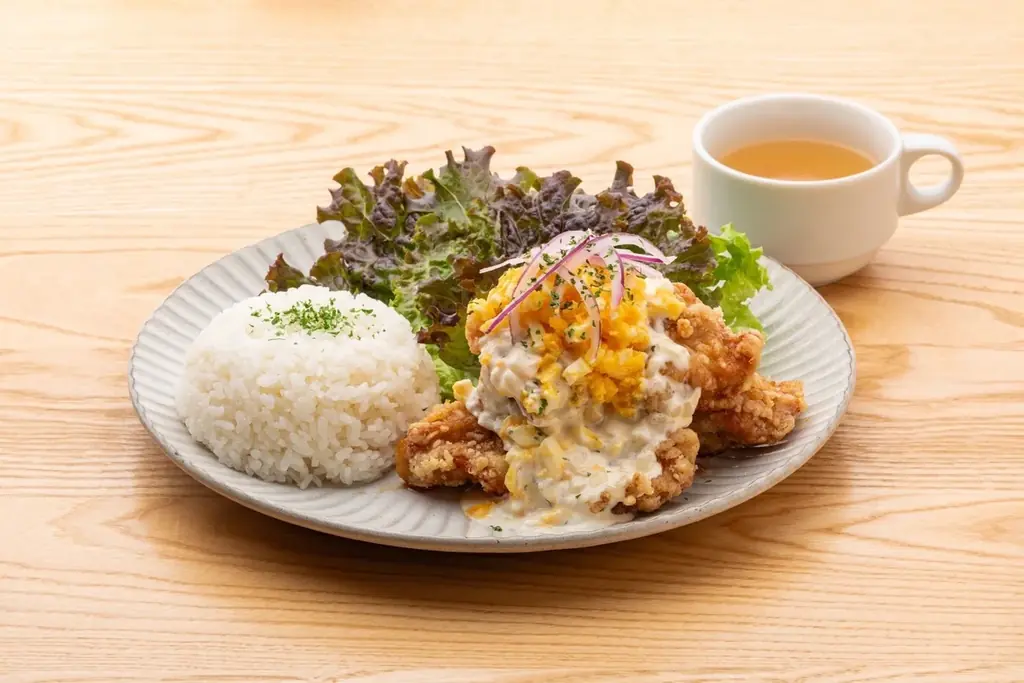 - 選べるランチ:コトリバーガー(牛肉100%のパテ) または チキン南蛮プレート(香ばしく揚げたチキンに甘酢ダレ)