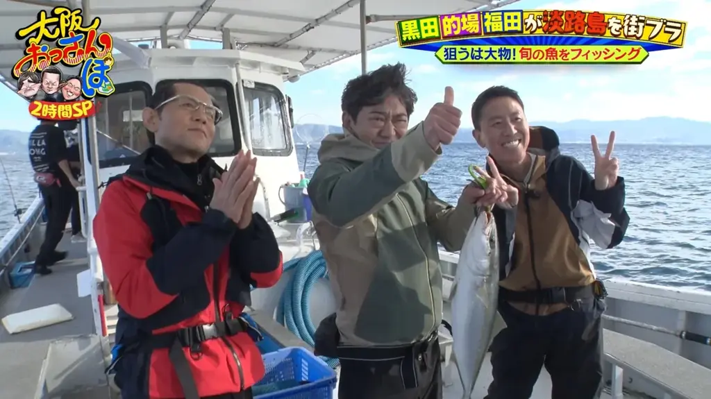 番組オープニングは釣り船の上から始まる。3人はまず淡路の海で魚釣りに挑戦し、釣法は大物を狙う「飲ませ釣り」。序盤は1時間以上あたりがなく経過するが、やがて黒田の竿にヒットし、立派なハマチを釣り上げる。釣りの成功はロケの転機となり、以降の調理と宴会に繋がる重要な出来事として描かれる。