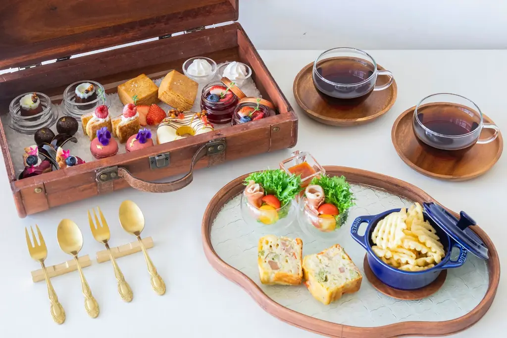 | セット内容 | セイボリー3種、スイーツ9種、ドリンク3杯(トランクケースまたはホワイトスタンドを選択) |