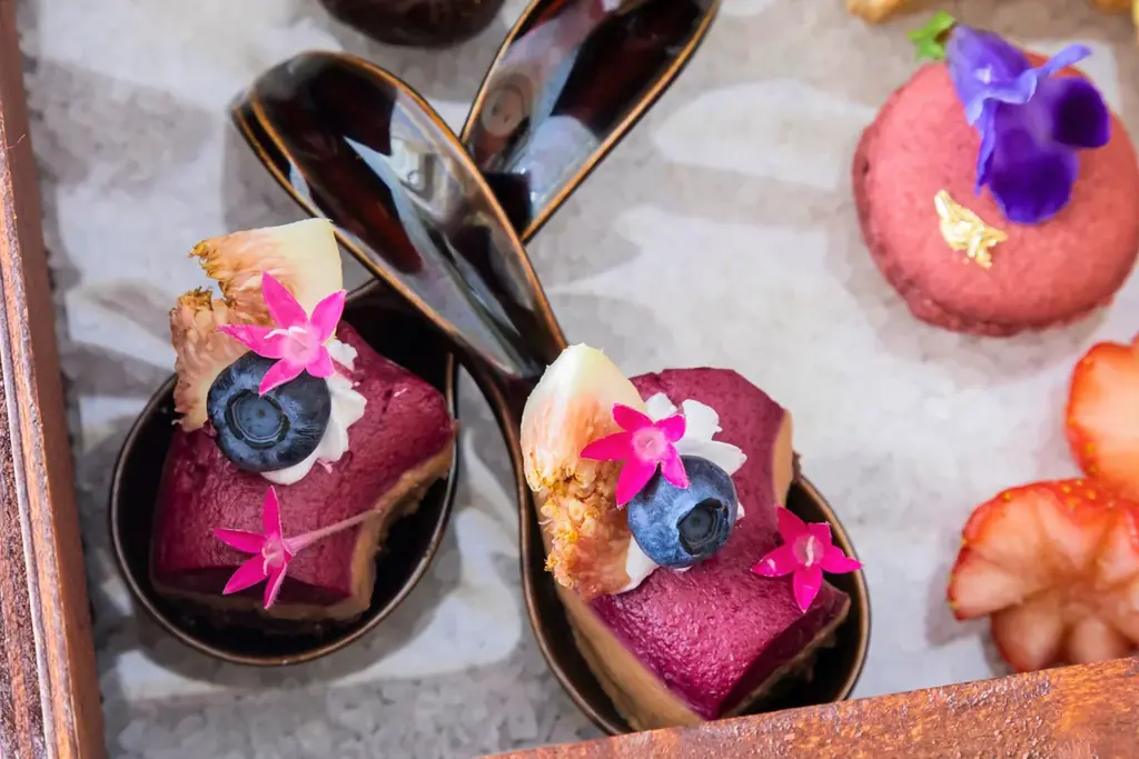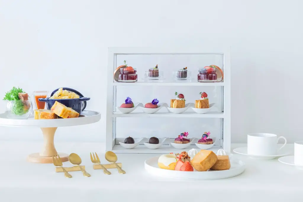 提供されるアフタヌーンティーセットは、基本構成としてセイボリー3種・スイーツ9種・ドリンク3杯付きです。スイーツは見た目の色彩や風味のバランスにこだわり、季節に合わせた素材と組合せられています。