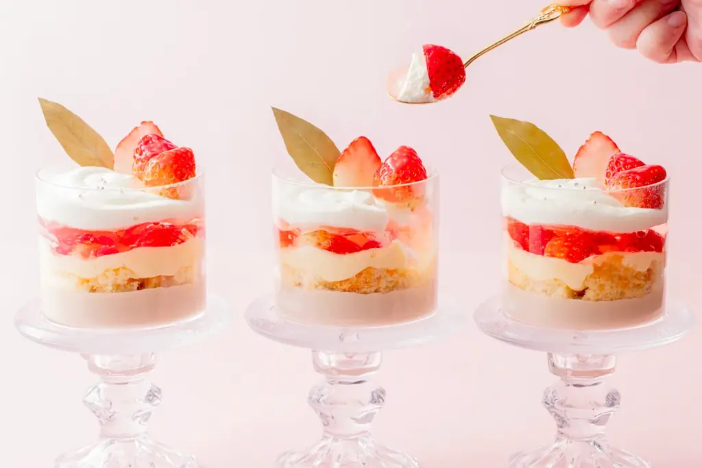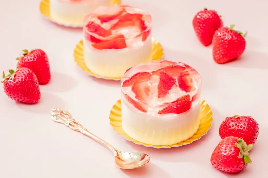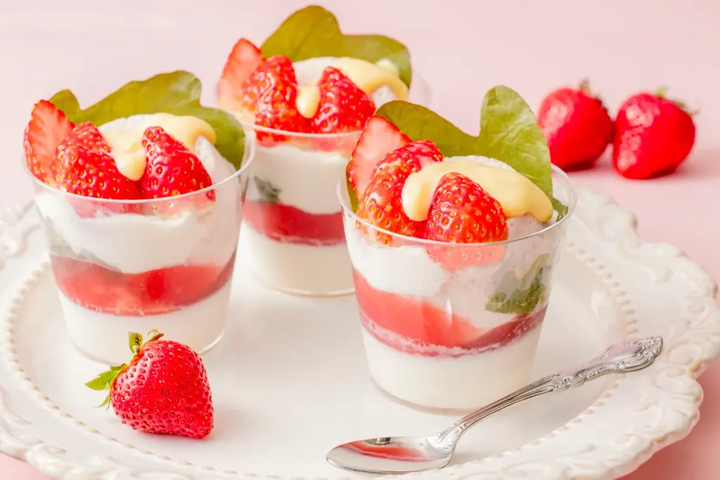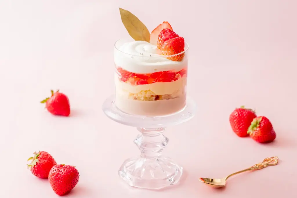 ふんわりとしたレアチーズムースに甘酸っぱい苺と透き通るような苺ゼリーを重ねたグラススイーツです。優しい酸味のチーズムースと苺のジューシーな甘み、爽やかなゼリーが調和し、ティータイムを華やかに彩ります。