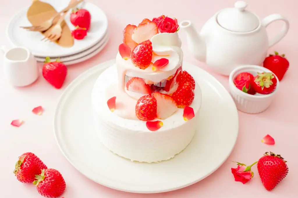 苺をサンドしたケーキの上に約7cmのショートケーキを重ねた2段構成で、国産苺をふんだんに飾っています。ピンクのグラサージュと食用ベルローズが視覚的な華やかさを演出し、記念日やお祝いの場面にふさわしいビジュアルです。